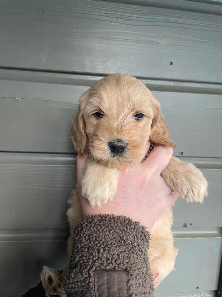 Hij zal naar verwachting uitgroeien tot een ( iets kleinere ?) medium van ongeveer 50 cm, hetzelfde formaat als zijn vader Quinn. Hij heeft een fleeevacht, apricot kleurig en hier en daar leuke witte vlekken. We hebben hem leren kennen als een nieuwsgierige pup met een open karakter, helemaal niet bang aangelegd. Hij zou prima passen in een gezin met kinderen. Hij mag zaterdag 21 februari verhuizen.